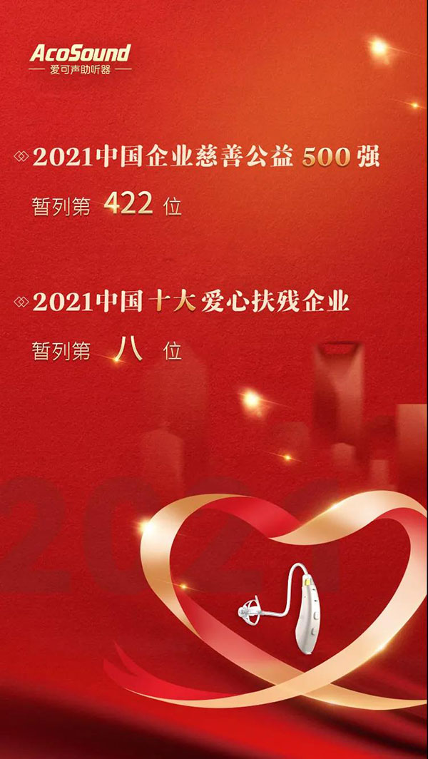 喜报!爱可声荣获“中国企业慈善公益500强”&“2021中国十大爱心扶残企业”