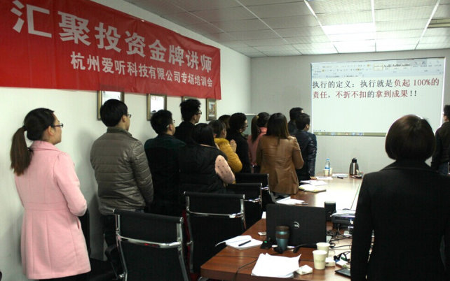 一场关于“提升团队执行力”的专场培训会在杭州爱听科技公司会议室举行,本次培训会由汇聚集团金牌讲师张玉超老师主讲,公司上下几乎全员参与本次培训。