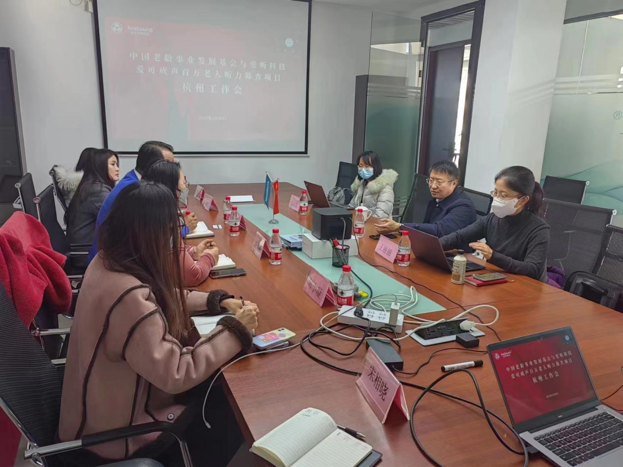 2022年,由中国老龄事业发展基金会联合杭州爱听科技有限公司发起“老年康复工程—爱可成声”公益项目,已开展了两批公益培训活动。2023年1月30日,中国老龄事业发展基金会老年康复工程办公室主任张立新、副主任王丽丽、 秘书长邹海霞和杭州爱听科技董事长李鹏、执行董事姚秀萍以及相关项目负责人于杭州爱听科技有限公司四楼会议室召开项目研讨会。