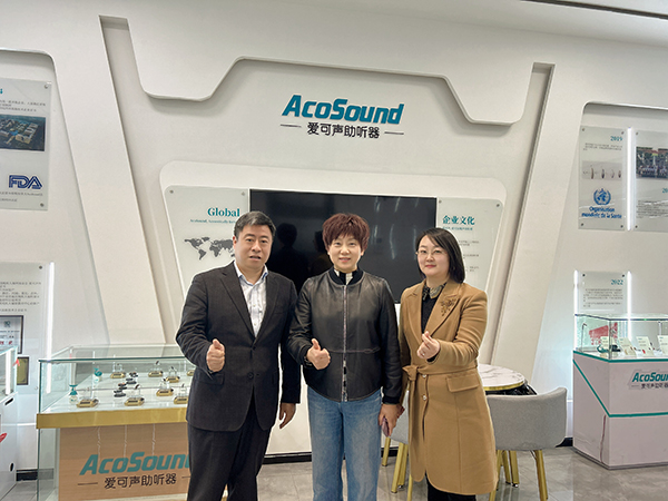 2023年3月2日,杭州市余杭区政协副主席、农工党杭州市主委付丽华,农工党浙江省委五支部主委詹其顺来访杭州爱听科技有限公司-爱可声助听器,与爱可声助听器联总经理、农工党浙江省委五支部委员姚秀萍热烈交流,爱可声助听器全体成员对两位领导表示尊敬与欢迎。