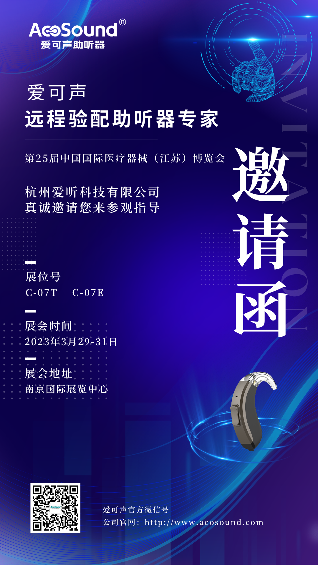 国产品牌爱可声受邀参加本次博览会,届时将在C-07T C-07E展位,展出本公司自主研发的远程验配助听器、智能迷你耳背式助听器、超大功率耳背式助听器等产品。欢迎各位领导、朋友莅临爱可声展台参观交流,期待与您相约展会现场~