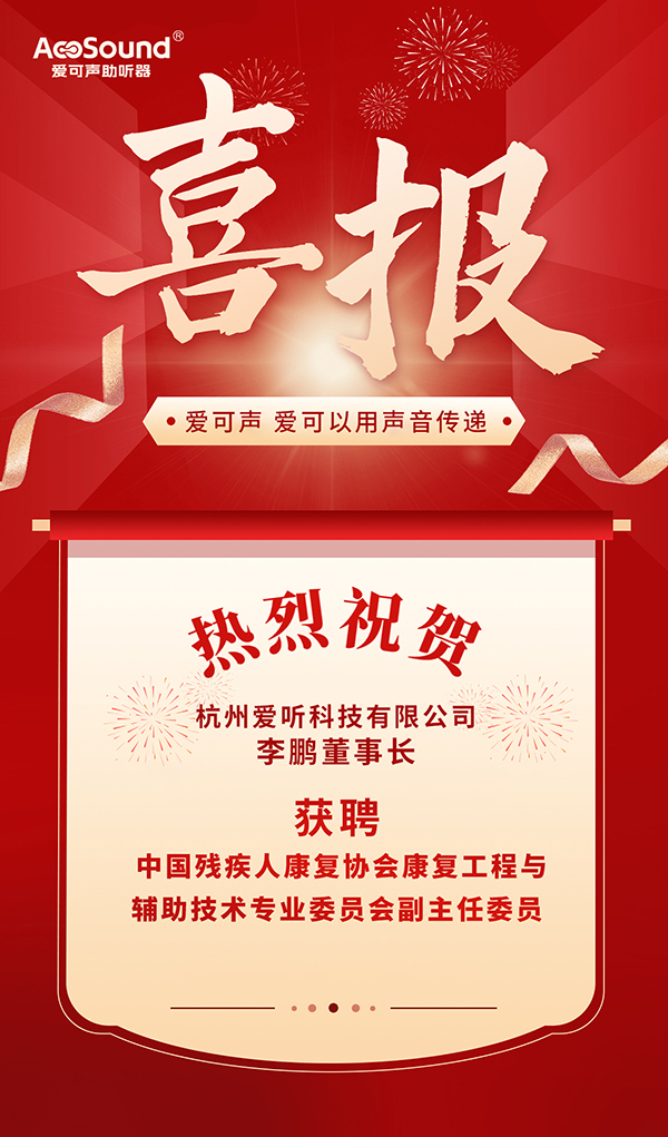 已暮春,夏将至,万物复苏,一切将会蓬勃发展!2023年5月,杭州爱听科技有限公司收获中国残疾人康复协会的聘书!热烈祝贺李鹏董事长被聘请为中国残疾人康复协会康复工程与辅助技术专业委员会副主任委员!